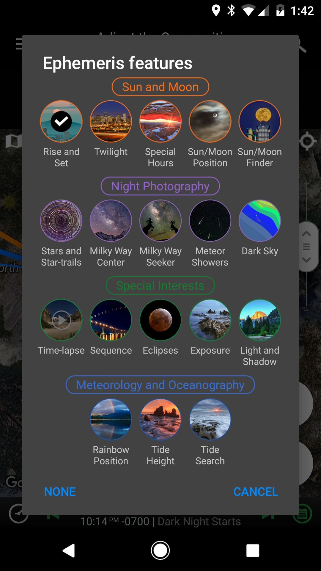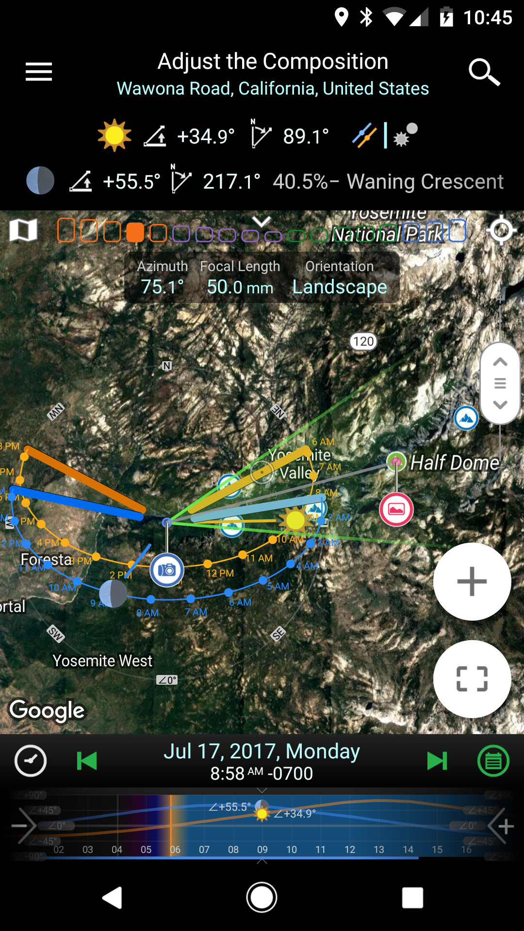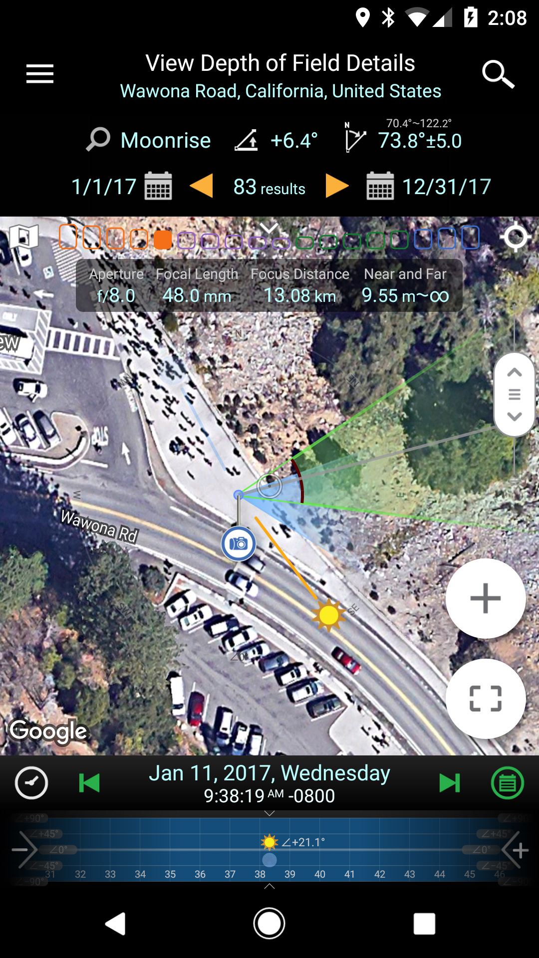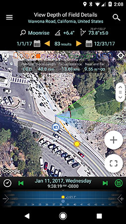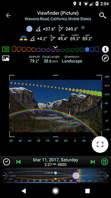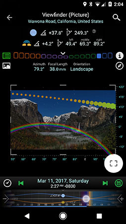 Great app, makes me want to do more photography So many good features, hard to go over one by one. The easy way of sliding the time and seeing the view changes is the most impressive. It even adjusts the view based on lense focal length. I heard from a friend about this app, and it replaces all the silly small sunrise sunset, tide apps I used before. This is an all in one app. Great work, worth much more than the price charged.