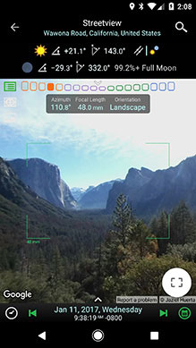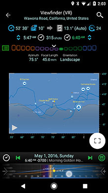 Nothing is more familiar to a photographer than the camera's viewfinder. Now you can use the Planit! to see a simulated viewfinder. It can be viewfinder of VR, AR, Picture or Streetview with ephemeris overlays.